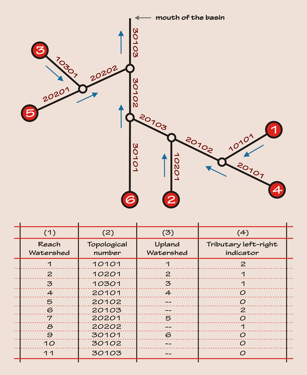 Reach watersheds Reach watersheds are numbered consecutively, from 1 to R, in order of increasing five-digit order-branch-reach topological number; see, for instance, Cols. 1 and 2 of Fig. 1, respectively. To determine the array [set] of topological numbers, assume that the order of the highest-order branch (main stem) is N. Branches contributing to this branch are of order (N - 1); branches contributing to order (N - 1) branches are of order (N - 2), and so forth. By definition, the branch of lowest order is of order 1, and all the other branches are of respectively higher order (2, 3, ..., up to N). Each branch has a consecutive number, from upstream to downstream; for example, the [middle] 01 in 20102 in Fig. 1. Each numbered branch has one or more consecutively numbered reaches, from upstream to downstream; for example, the [right] 03 in 20103 in Fig. 1. Upland watersheds Upland watersheds are located immediately upstream of reach watersheds with reach numbered 01. Upland watersheds are numbered consecutively, from 1 to U, in order of increasing topological number of its reach watershed; see, for instance, Col. 3 of Fig. 1.